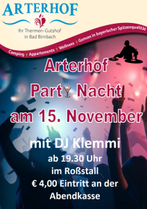 Arterhof Party Nacht am 15. November mit DJ Klemmi ab 18.30 Uhr im Roßstall € 4,00 Eintritt an de...